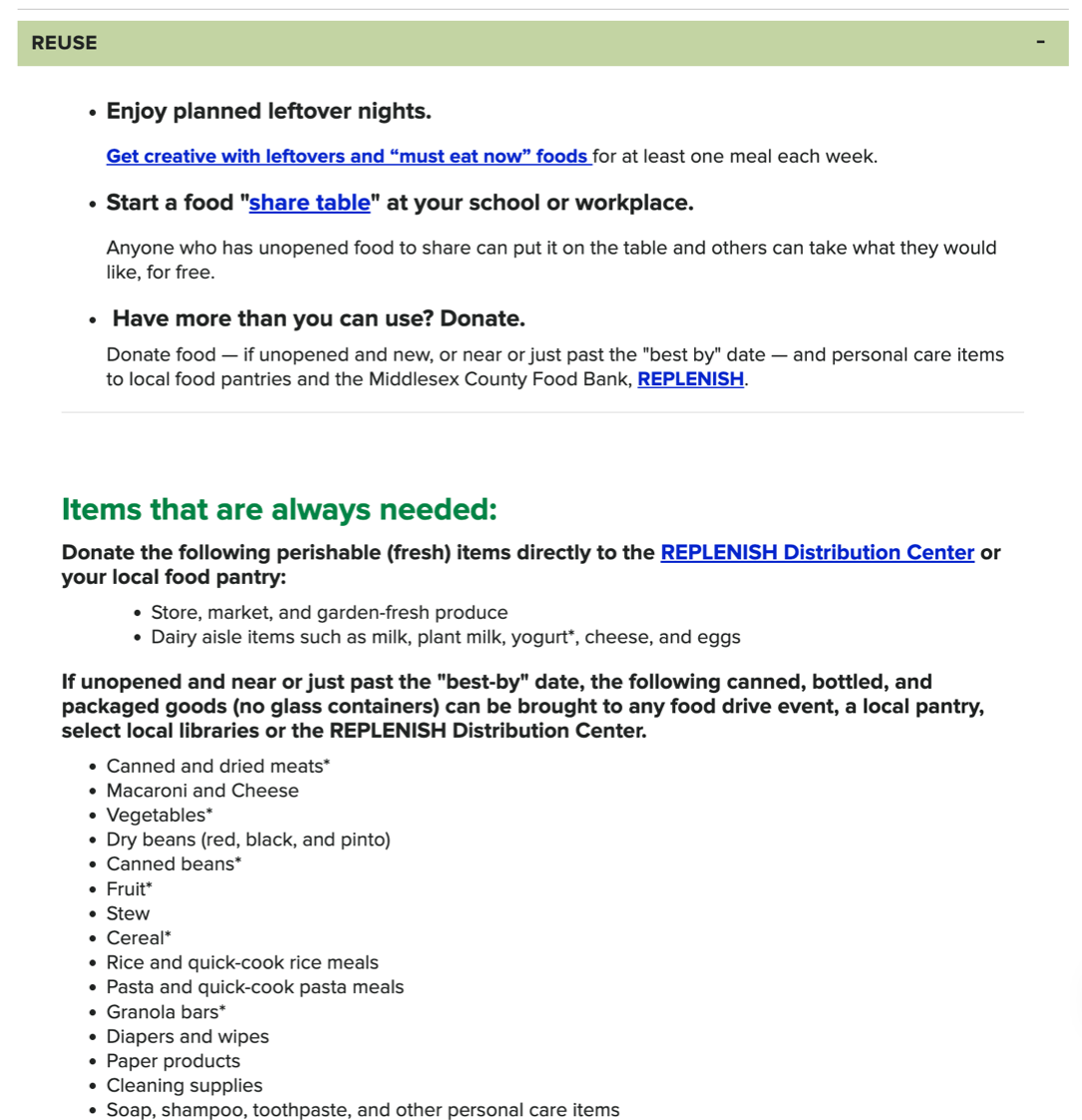 The following Tips to Reduce Food Waste are from Middlesex County solid waste management program and can be found at this link: www.middlesexcountynj.gov/government/departments/department-of-public-safety-and-health/office-of-health-services/solid-waste-management-program/reduce-food-waste