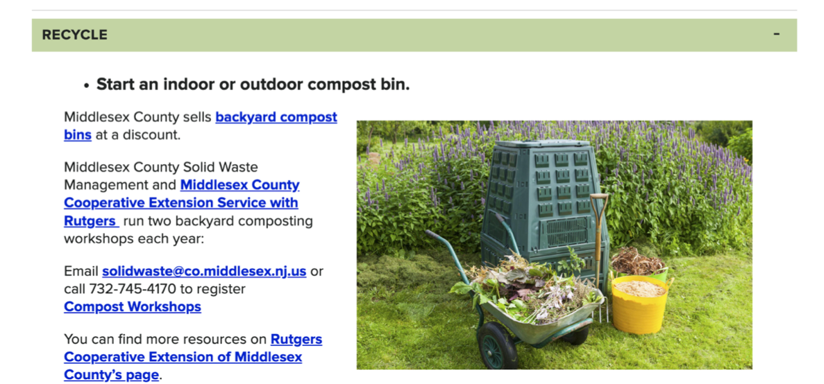 · Compost! Attend a workshop (see below) or check out details from one of the resources shared (Middlesex County)
